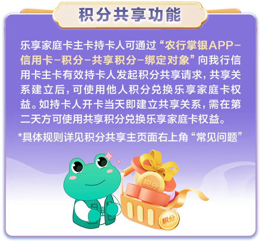 简单说,当你用自己的乐享家庭卡兑换权益时,如果积分不够,可以直接调用你绑定的另一位家人的农行信用卡积分来凑!
