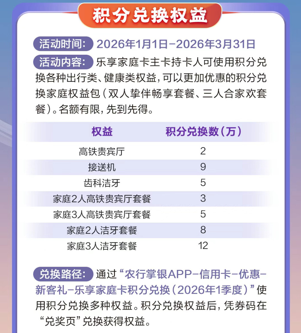 这意味着什么?意味着积分不再是每个人卡上的“死数字”,而是变成了可以灵活调度的家庭共同资产。尤其适合这种场景:你自己会玩卡,但父母或配偶虽然也会用农行卡,却对积分兑换不怎么上心,积分常年躺着睡觉。现在好了,他们的积分可以被你“激活”,用来为全家人兑换实用的贵宾厅、洁牙服务,瞬间价值最大化。