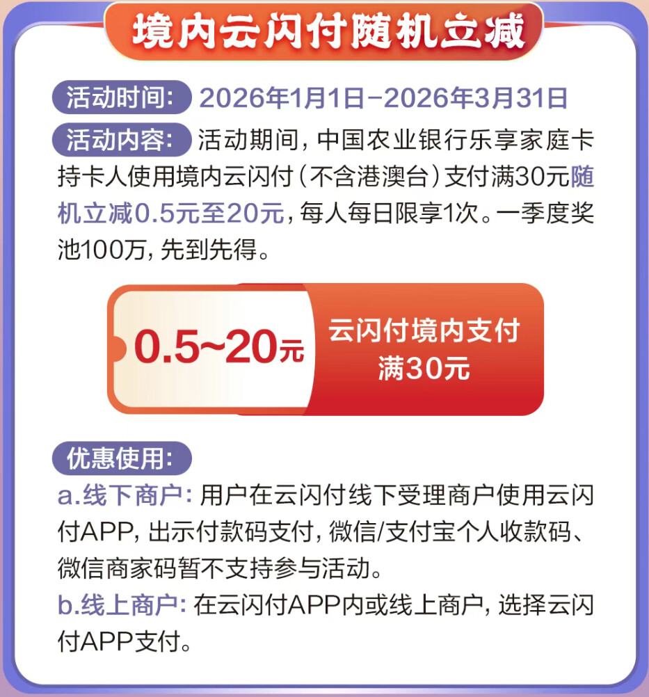 云闪付满30元随机立减:每天笔笔有机会减0.5-20元,活动奖池100万。日常买菜、购物顺手就用,属于“无脑刷”的小惊喜。