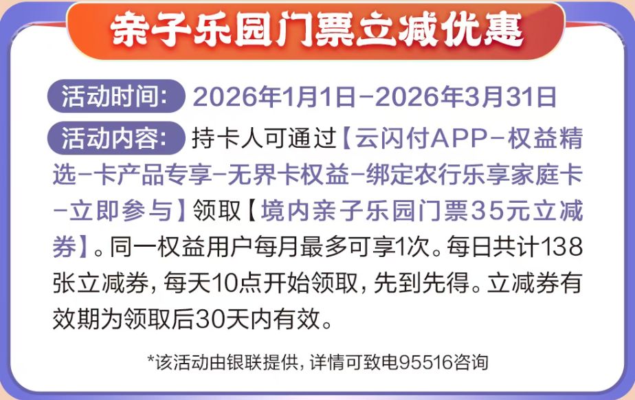 银联无界卡专属礼遇:每月消费达标(5/10/15笔),可以领还款券、立减券或者抽奖(红包、视频会员等)。另外每月还有35元亲子乐园门票立减券,适合有娃的家庭。