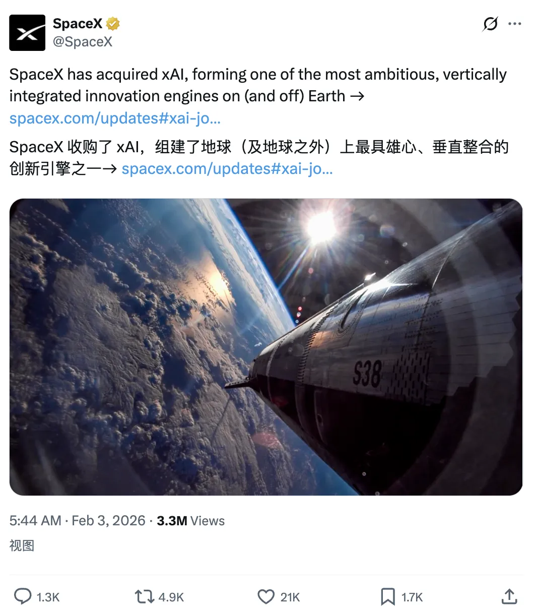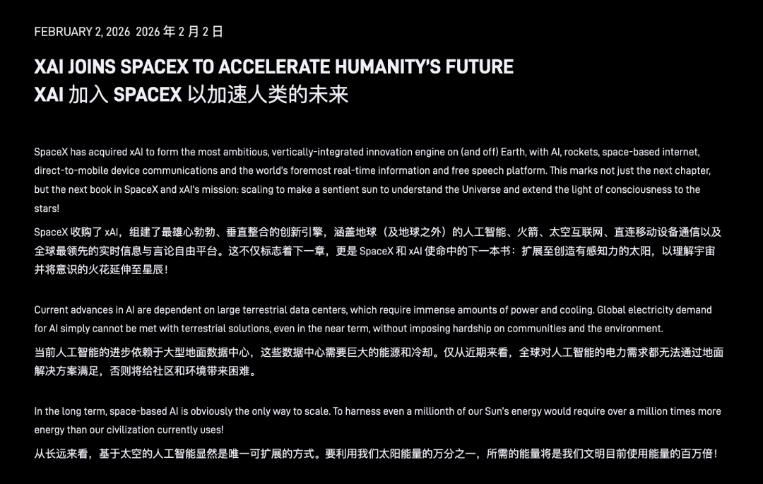 这篇博客的开头,气势就直接拉满了:“SpaceX 已完成对 xAI 的收购,目标是打造一个在地球之上、也在地球之外,最雄心勃勃的垂直整合型创新引擎”