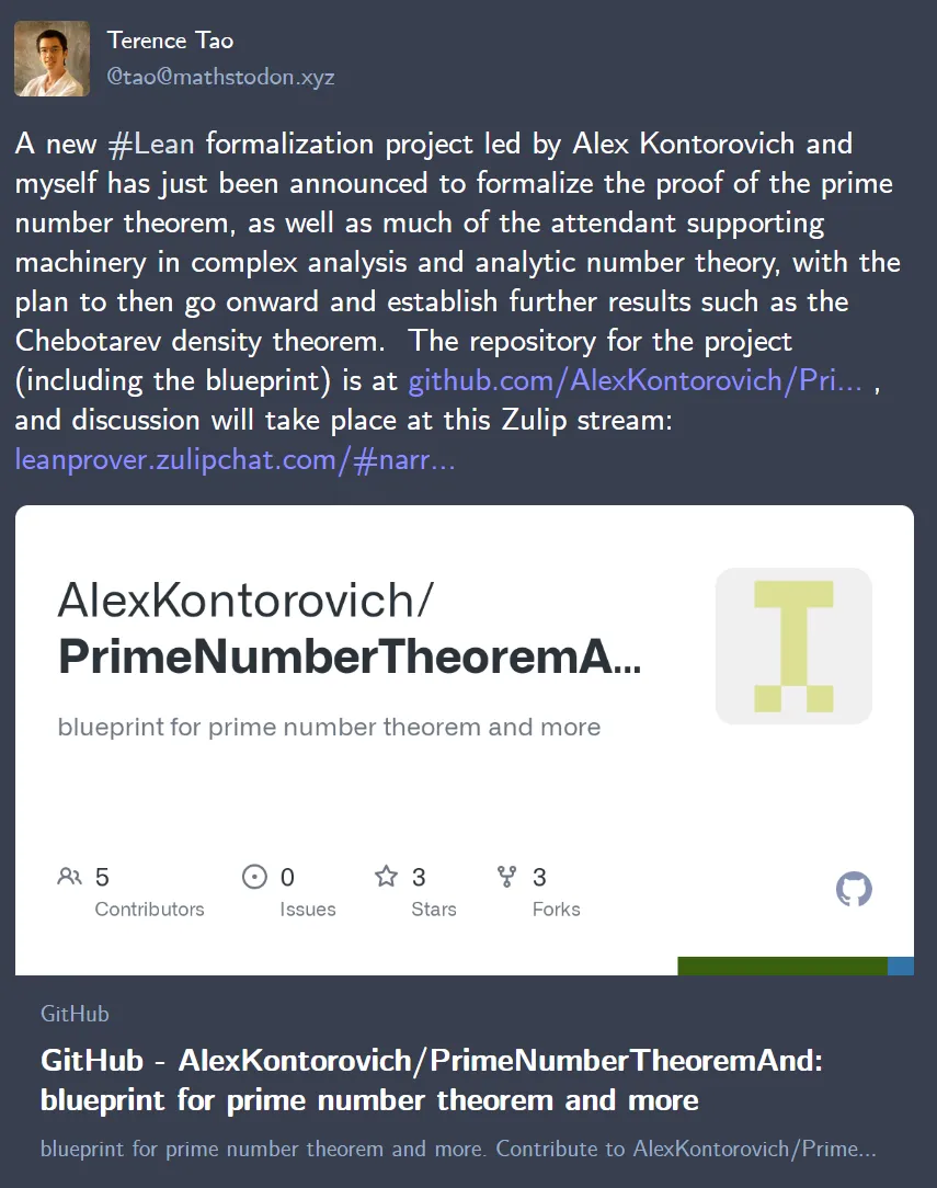 「由 Alex Kontorovich 和我领导的一个新的 Lean 形式化项目刚刚正式宣布,该项目旨在形式化素数定理(prime number theorem,PNT)的证明,以及伴随而来的复分析和解析数论的支持机制,并计划给出进一步的结果如 Chebotarev 密度定理。」著名数学家陶哲轩在个人博客中写道。