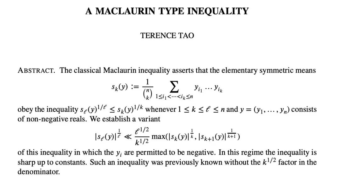 形式化证明本质上是一种计算机程序,但与 C++ 或 Python 中的传统程序不同,证明的正确性可以用证明助手(比如 Lean 语言)来验证。举例来说,陶哲轩在论文《A MACLAURIN TYPE INEOUALITY》中给出的证明只有不到一页,但形式化证明使用了 200 行 Lean 语言。