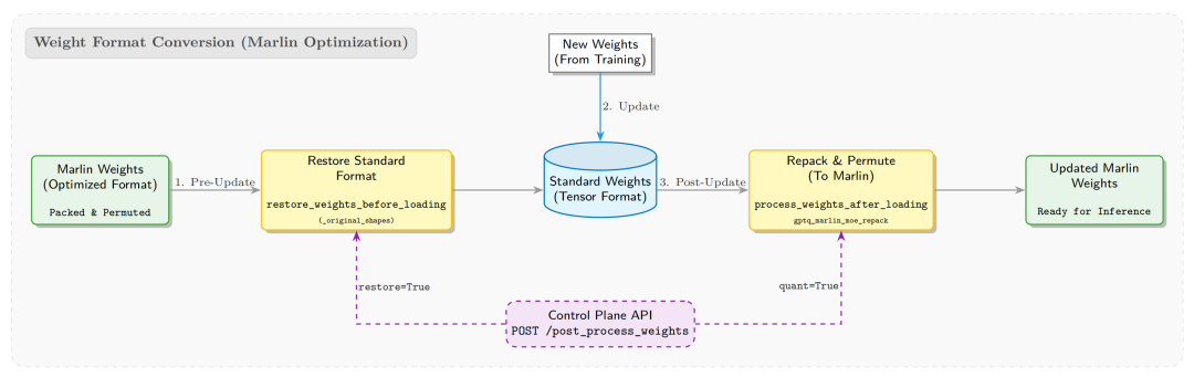 面对 RL 训练中频繁的权重更新需求,首先需要解决格式兼容性问题。为此,我们设计了一套逆向的 `restore_weights_before_loading` 保护机制。该机制利用缓存的 `_original_shapes` 元数据,能够在权重更新动作发生前,强制将当前内存中的 Marlin 权重格式还原(Resize)回原始形状。这一设计有效防止了因维度不匹配导致的运行时错误,确保模型能够在标准权重格式与 Marlin 权重格式之间平滑切换。此外,我们还在系统层面新增了 `post_process_weights` API,允许控制平面根据训练节奏显式触发这一流程。