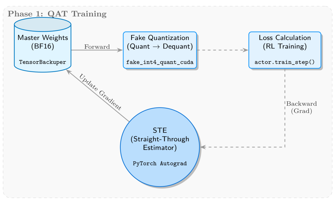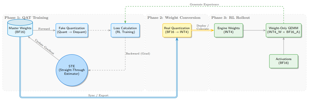 * 训推一致:训练端QAT确保权重符合INT4分布,推理端执行W4A16计算,均通过BF16 Tensor Core运算。