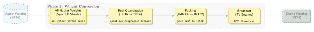 在权重转换阶段,我们将训练收敛的 BF16 权重导出并执行真实量化(Real Quantization),将其转换为推理引擎适配的 INT4 格式(如 Marlin)。