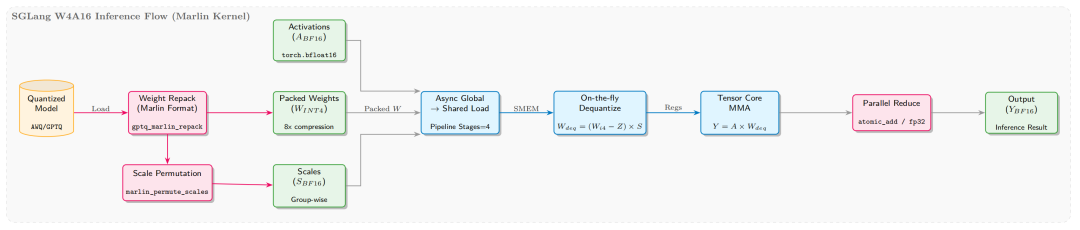 为了复用 SGLang 在推理端已有的优化,我们直接采用了其内置的 作为 INT4 的推理方案。然而,这在工程落地时我们遇到了显著的 “格式鸿沟”:QAT 训练产出的是类似 Hugging face 上的标准格式权重,而 SGLang 推理引擎的 Marlin Kernel 则强制要求权重必须经过特定的打包(Pack)与重排(Permute)处理,方能被 Kernel 高效读取。