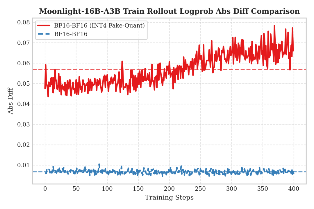 图4则展示了 “关闭 QAT 训练,直接进行 INT4 Rollout” 的场景(即红线部分)。这对应了传统的训练后量化(PTQ)模式。由于模型在训练阶段从未接触过量化噪声,直接将权重压缩至 INT4 不仅造成信息的剧烈丢失,更导致推理时的特征分布与训练时产生偏移,致使误差随着训练步数呈现震荡上升的趋势。
