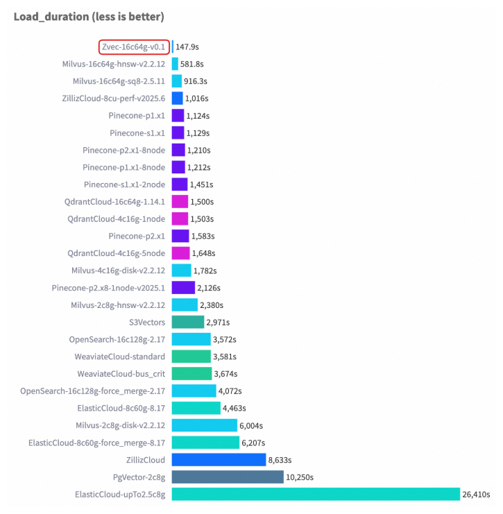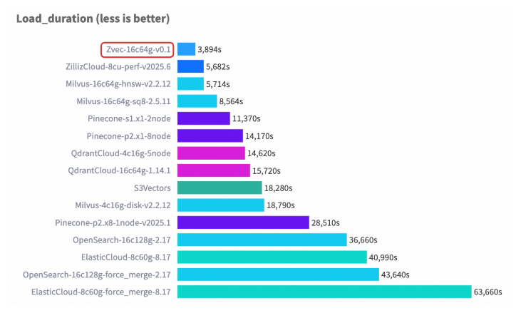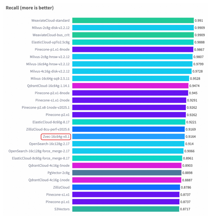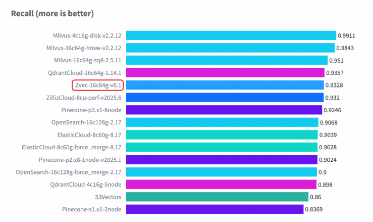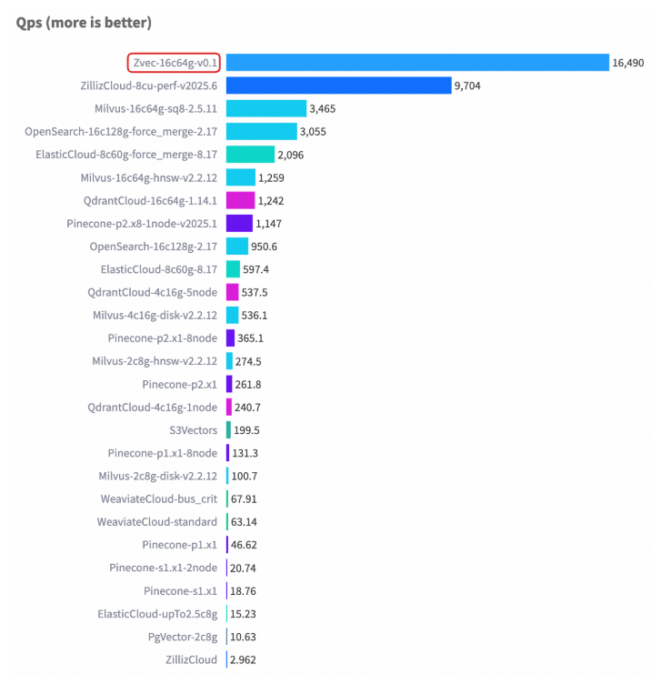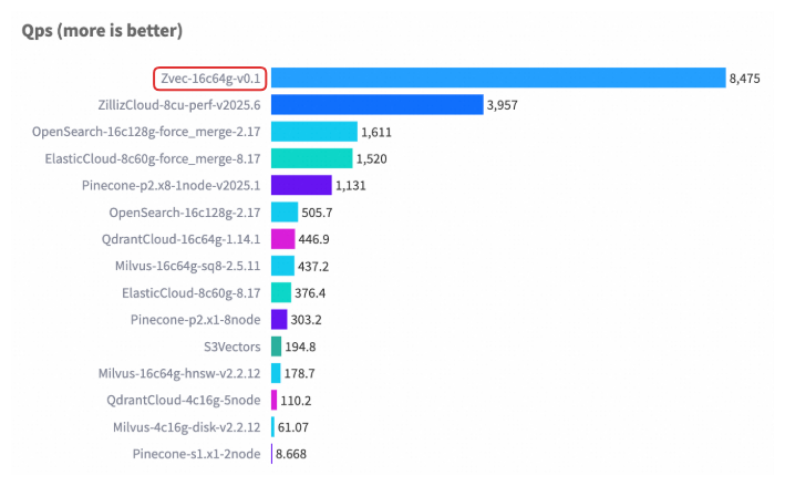 在 VectorDBBench 的典型场景(Cohere 10M 数据集)中,Zvec 在相当硬件配置以及对齐 Recall 水平的前提下,检索吞吐超过了 8000 QPS,是此前榜单首位(ZillizCloud)的 2 倍以上,同时构建延迟大幅缩短,展现出全面领先的性能优势。