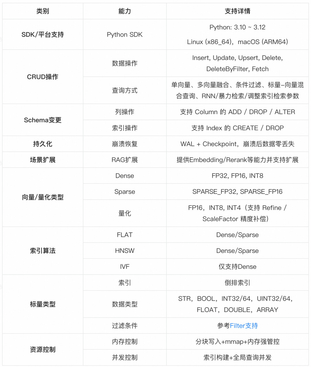 Zvec 从设计之初即以 RAG 场景为首要目标,向量能力完整覆盖 RAG 全生命周期,体现为以下核心能力: