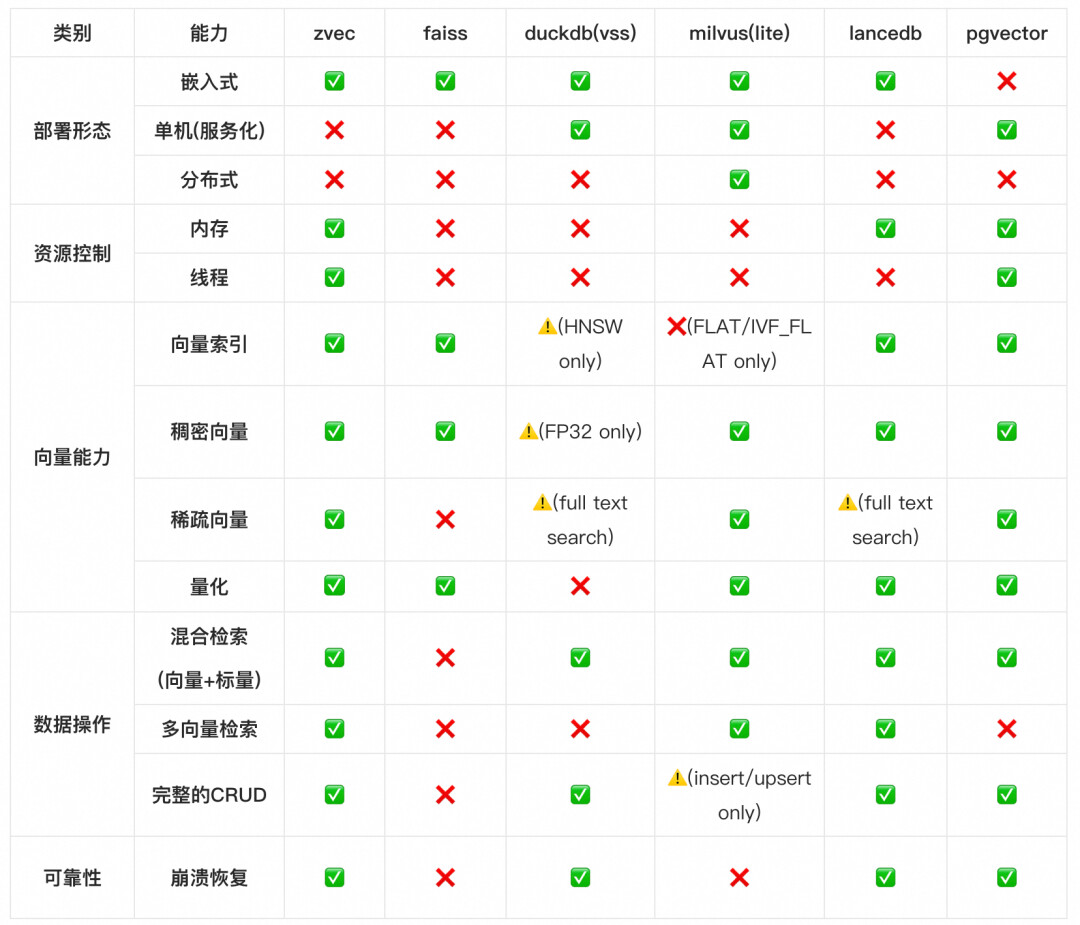服务化方案(如Milvus):依赖独立进程与网络通信,架构复杂、资源开销大,无法嵌入 CLI 工具、桌面应用或移动客户端,且运维负担重,与终端场景存在天然适配障碍。