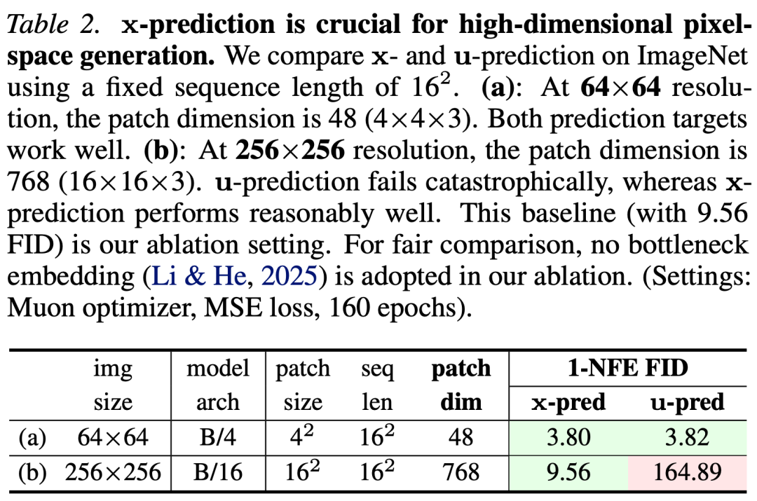 首先将 64×64 分辨率作为较简单的设置。当 Patch 大小为 4×4 时,Patch 维度为 48(即 4×4×3)。这一维度远低于网络容量(隐藏层维度为 768)。因此,pMF 在 x-prediction 和 u-prediction 下均表现良好。