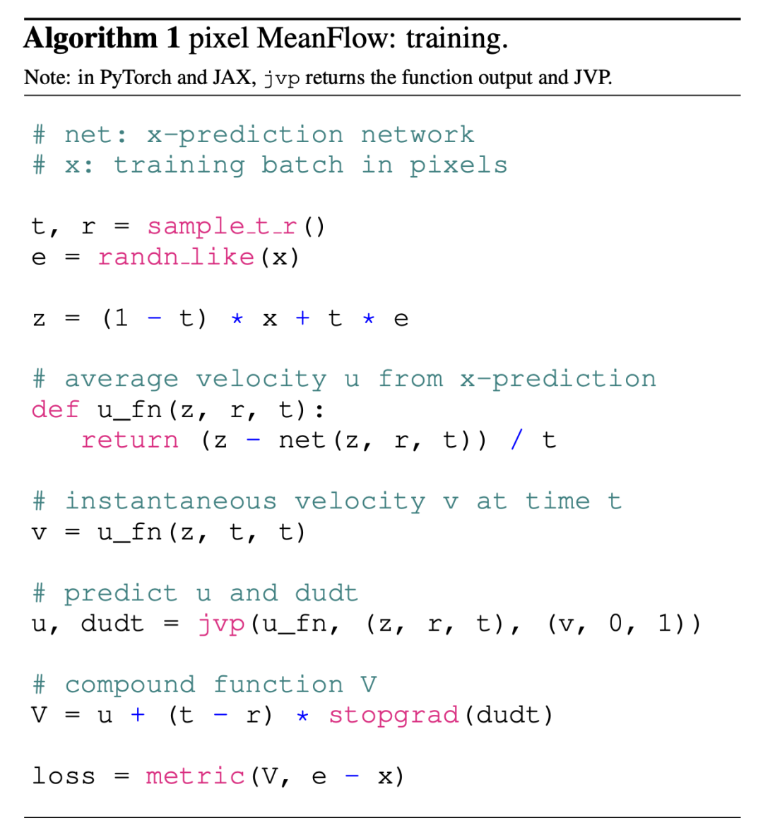 从概念上讲,这是基于 x-prediction 的 v-loss,其中 x 通过 x→u→v 的关系转换为 v 空间,从而对 v 进行回归。相应的伪代码见算法 1。遵循 iMF 的思路,该算法可以扩展以支持无分类器引导(CFG)。