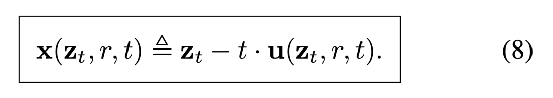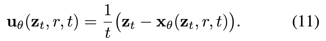 原论文等式 (5) 中定义的平均速度场 u 代表了一个潜在的基准真值(ground-truth),它取决于 p_data、p_prior 以及时间调度,但与网络无关(因此不依赖于参数 θ)。团队引出了一个定义为 x (z_t, r, t) 的新场: