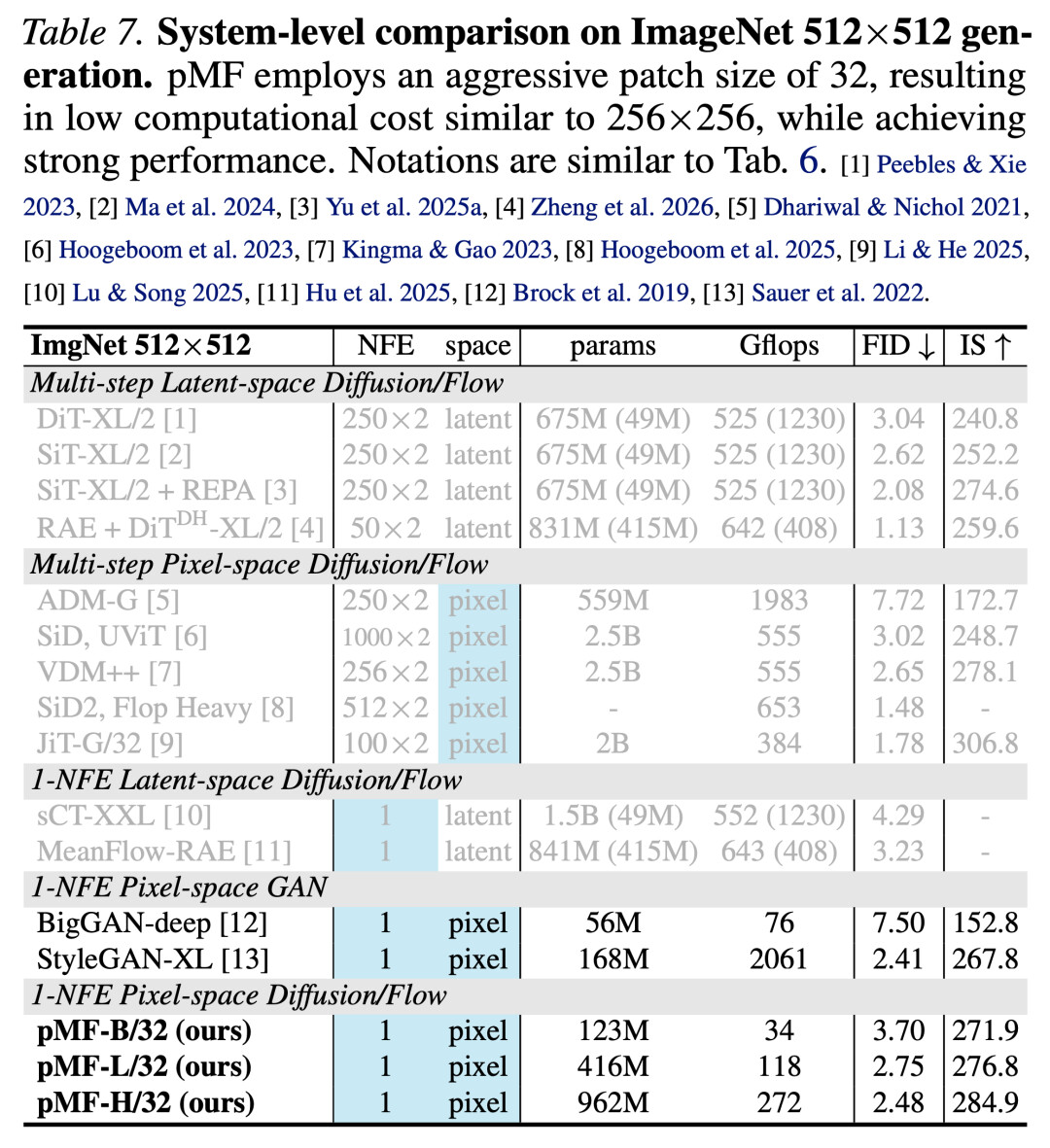 最后,团队在表 6(256×256)和表 7(512×512)中 ,将 pMF 与之前的模型进行了对比。