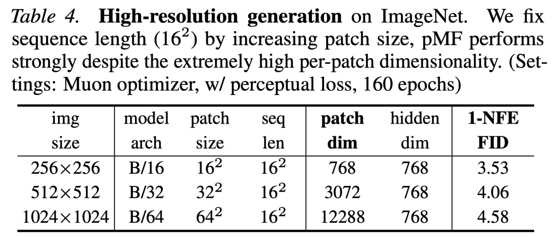 关于高分辨率生成,团队在表 4 中研究了分辨率在 256、512 和 1024 下的 pMF。在保持序列长度不变(16^2)的情况下,不同分辨率下大致维持了相同的计算成本。这样做会导致极其激进的 Patch 大小(例如 64^2)和 Patch 维度(例如 12288)。
