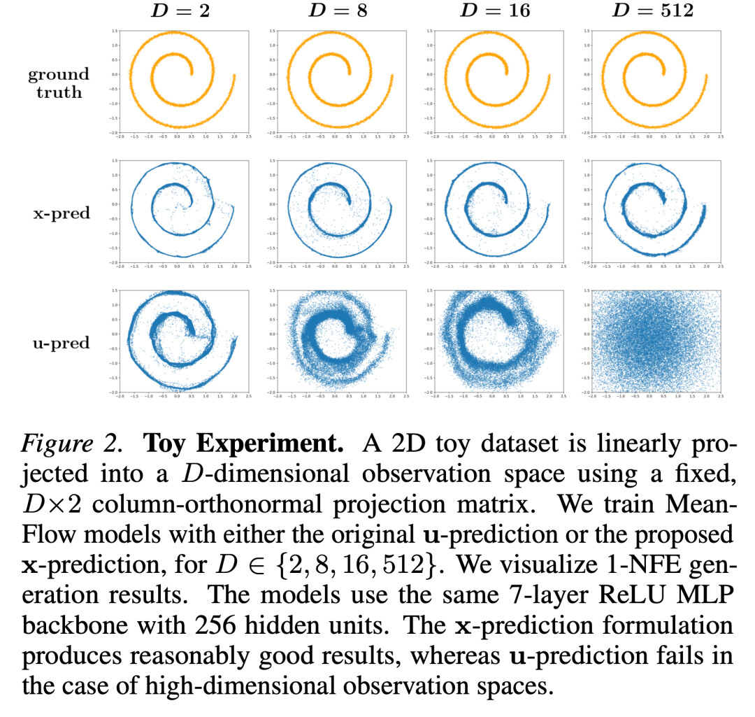 团队首先通过一个 2D 玩具实验表明,「当底层数据位于低维流形上时,在 MeanFlow 中使用 x-prediction 更加理想。」
