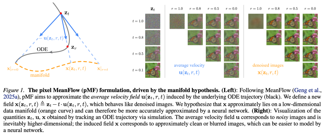 为了兼容这两种设计,团队引入了一种转换机制,将 v、u 和 x 三个场联系起来。实验证明,这种设计更符合流形假设,并且产生了一个更易于学习的目标(见下图 1)。