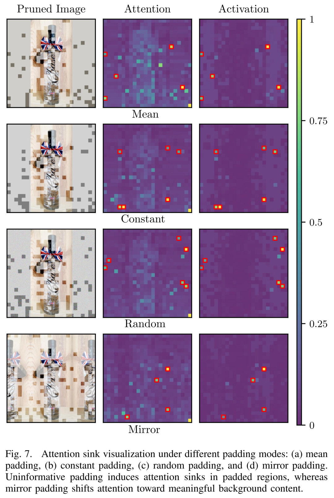第二类是 padding 引发的 attention sink 现象。在实际输入中,为了统一尺寸,图像往往需要 padding,但这些区域在语义上是 “空白” 的。然而,由于 hidden state 中出现异常激活,padding 对应的 token 反而可能获得较高 attention,从而被错误地保留下来。下图是 pad 区域填充不同的数值时,pad 区域对应的 attention score 数值以及 hidden states 的激活值。