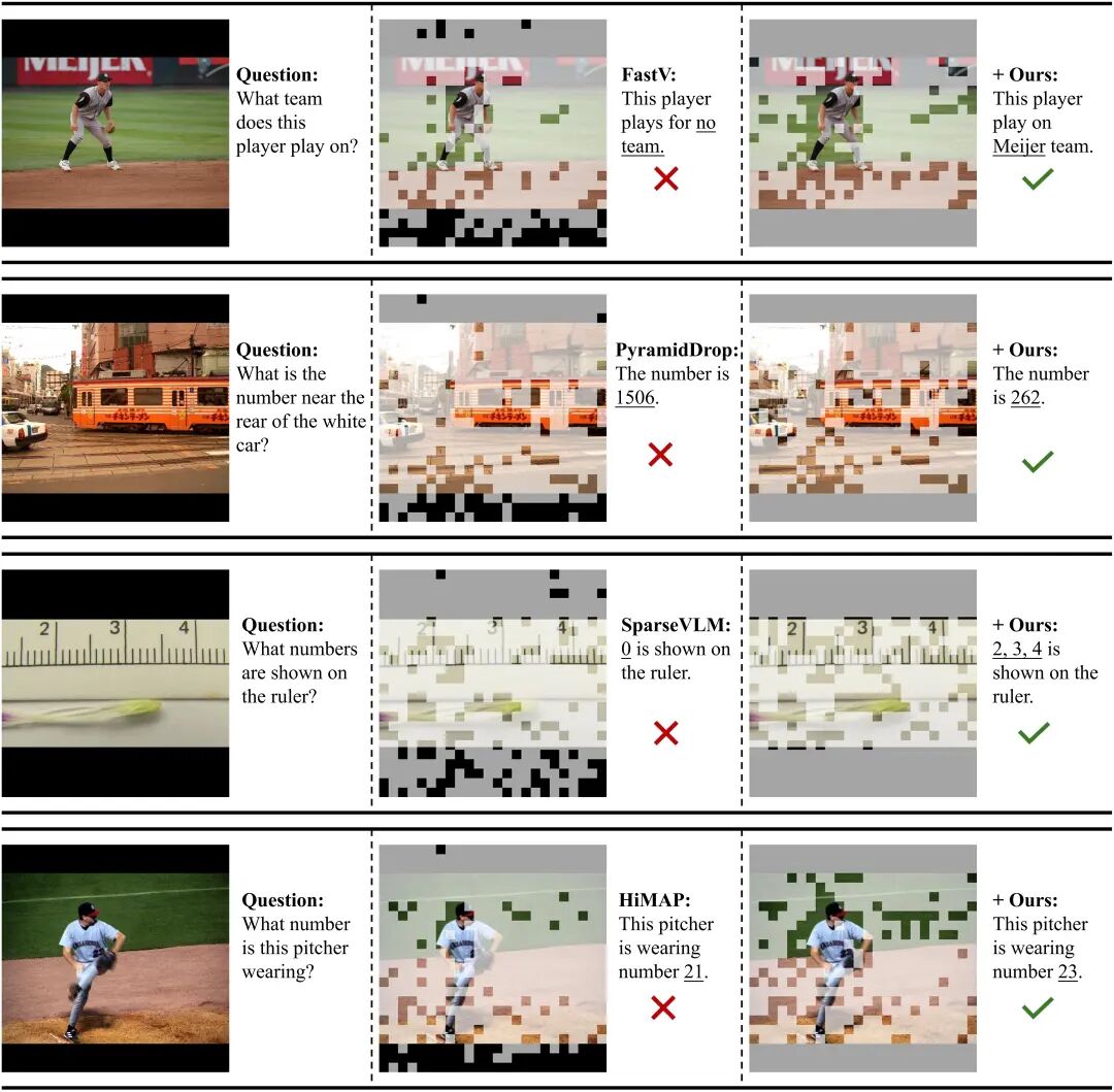 此外,通过对实验结果的可视化分析,原始 attention-based 剪枝方法往往保留了大量位于图像下方或 padding 区域的视觉 token,而与问题语义密切相关的关键区域却容易被忽略。引入 attention 去偏修正后,模型保留的视觉区域更加集中于目标物体及关键细节位置,有效减少了无关背景的干扰。该结果直观验证了 attention 去偏在提升剪枝合理性和可解释性方面的作用。