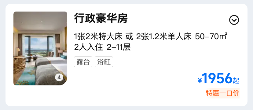 海棠湾君悦在旺季的房价一直居高不下,2月基础房都要2000起步,套餐给的亲子海景房,价格更是高达3000多,套餐券后1130/晚,价格不错,如果加价也在预算内,还是不错的。