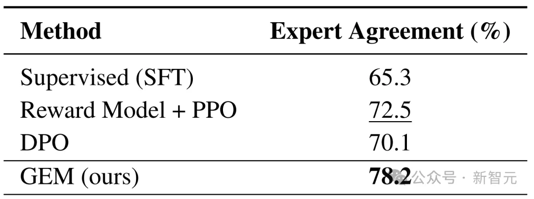 此外,在医学偏好验证集上(表 2),GEM达到78.2%的专家一致性(expert agreement),显著高于传统监督(65.3%)和DPO(70.1%),说明 GEM 能有效捕获专业医学中的细粒度偏好特征。