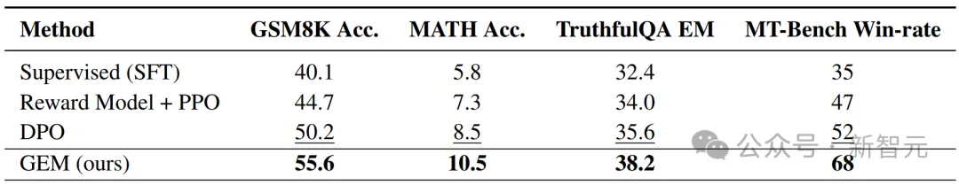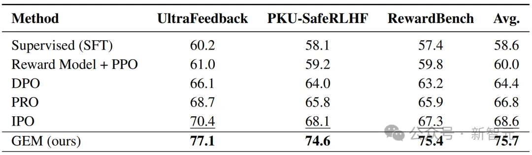 表1给出了GEM在三个通用偏好基准上的表现。实验结果显示:与传统奖励模型 + PPO 的 RLHF 模式相比,GEM 在仅使用约十分之一训练数据的情况下即可超越其性能。