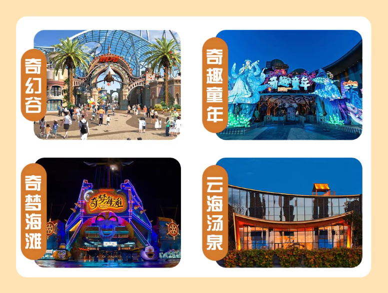 高级房1晚+2大1小奇趣童年/奇幻谷/云海汤泉2日票等,券后525元。