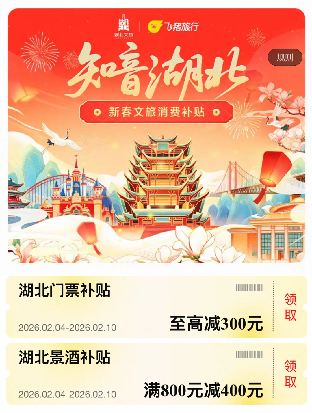 湖北文旅消费券来了,门票和酒店都有补贴最高立减400元,砸出了不少好价,今年寒假春节要去湖北的同学推荐关注!