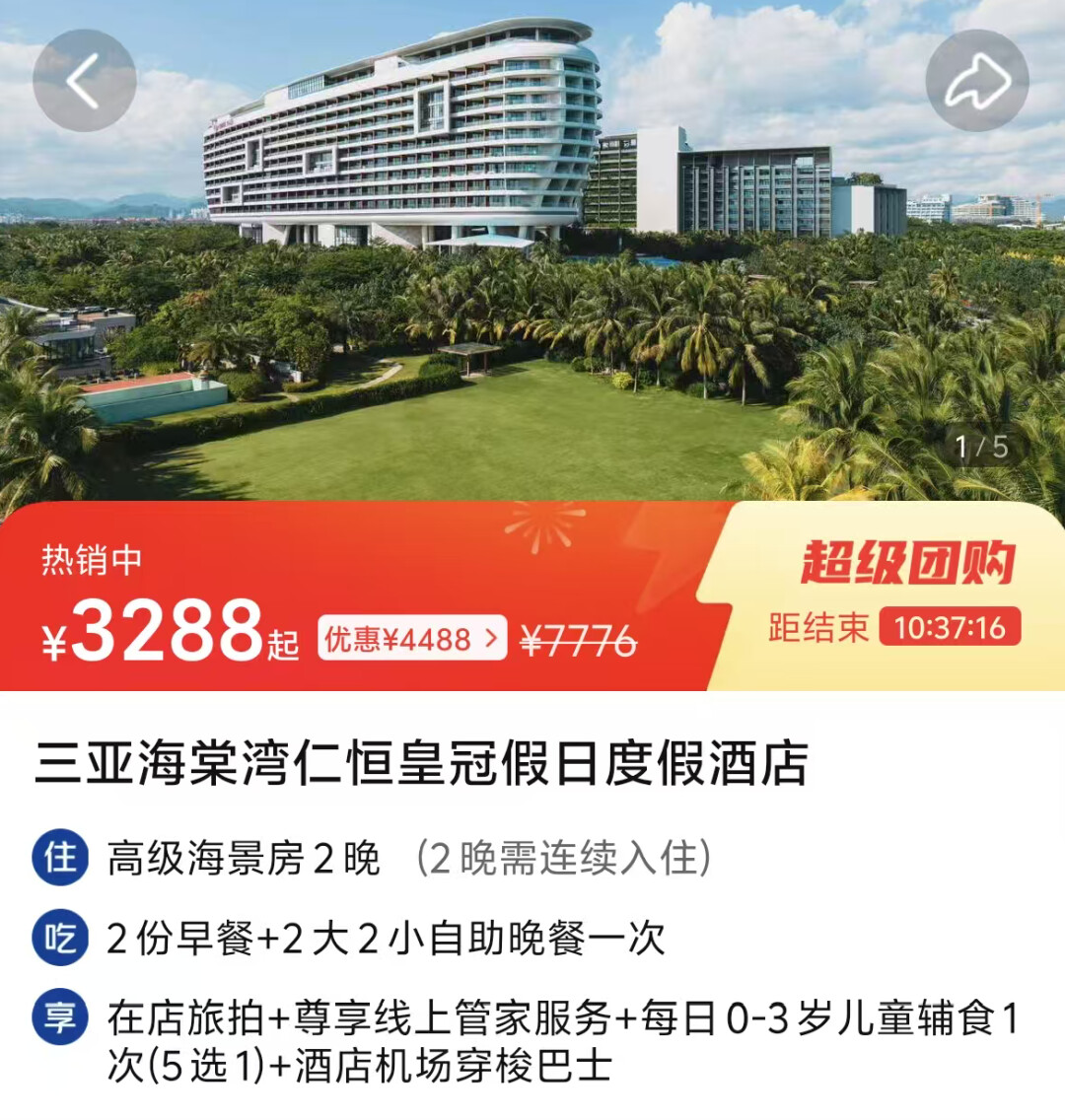 三亚海棠湾仁恒皇冠假日度假酒店2晚套餐 - 券后2788元(拍1份用-500券)