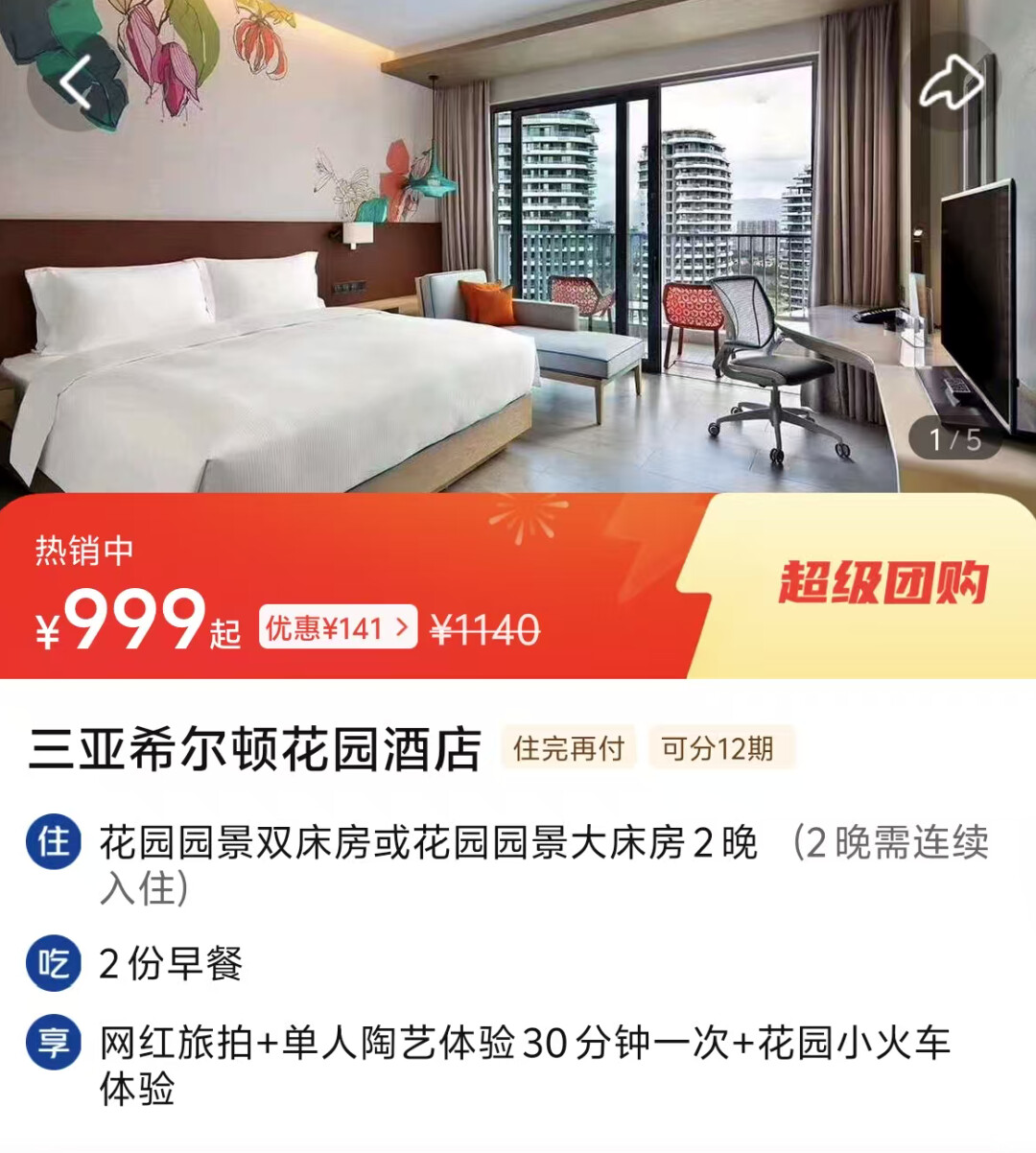 三亚希尔顿花园酒店2晚套餐 - 券后832元(拍3份用-500券)