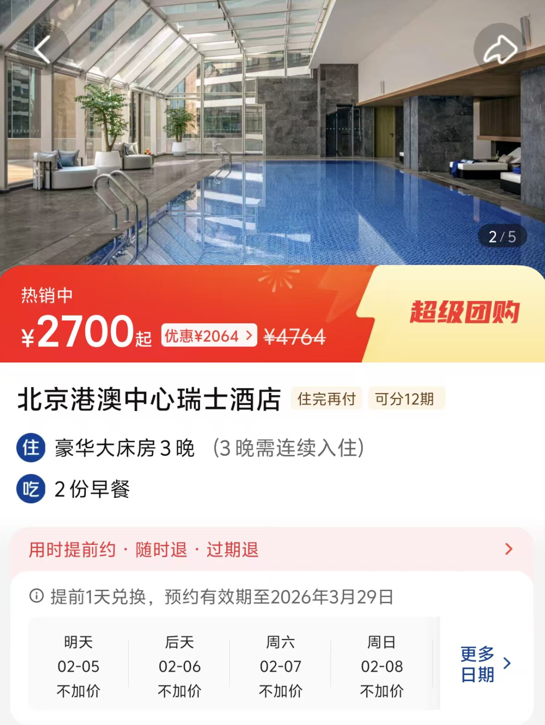 北京港澳中心瑞士酒店3晚套餐 - 券后2200元(拍1份用-500券)