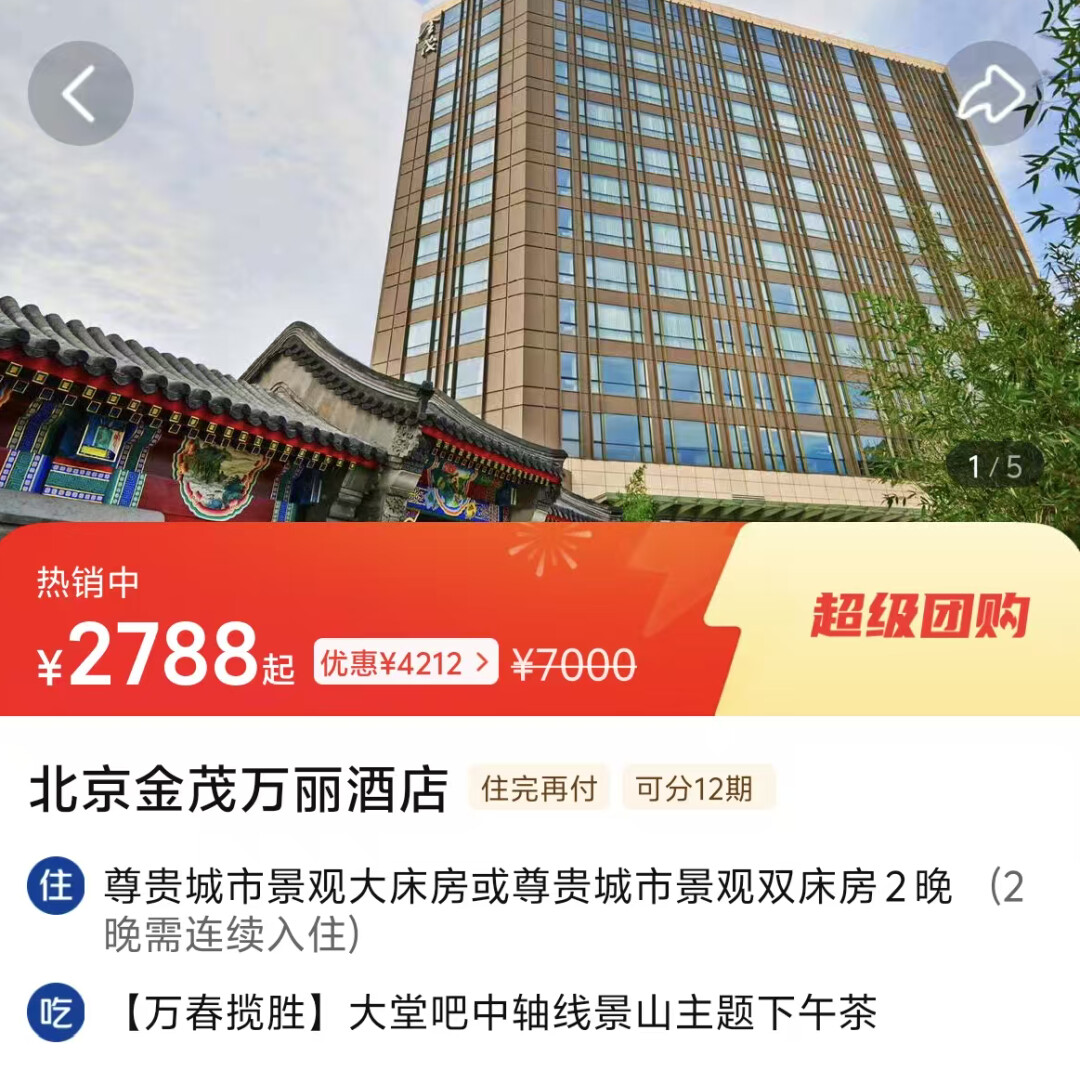 北京金茂万丽酒店2晚套餐 - 券后2288元(拍1份用-500券)