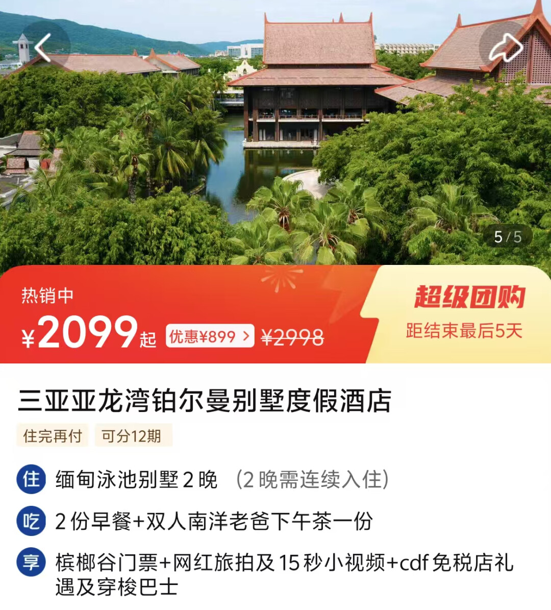 套餐包含每日双早和双人南洋老爸下午茶,还有网红旅拍+15秒小视频服务;喜欢购物的小伙伴可享cdf免税店礼遇及穿梭巴士。槟榔谷门票是送的。3月4日起全日期不加价,1599元住两晚泳池别墅,性价比碾压同类酒店!