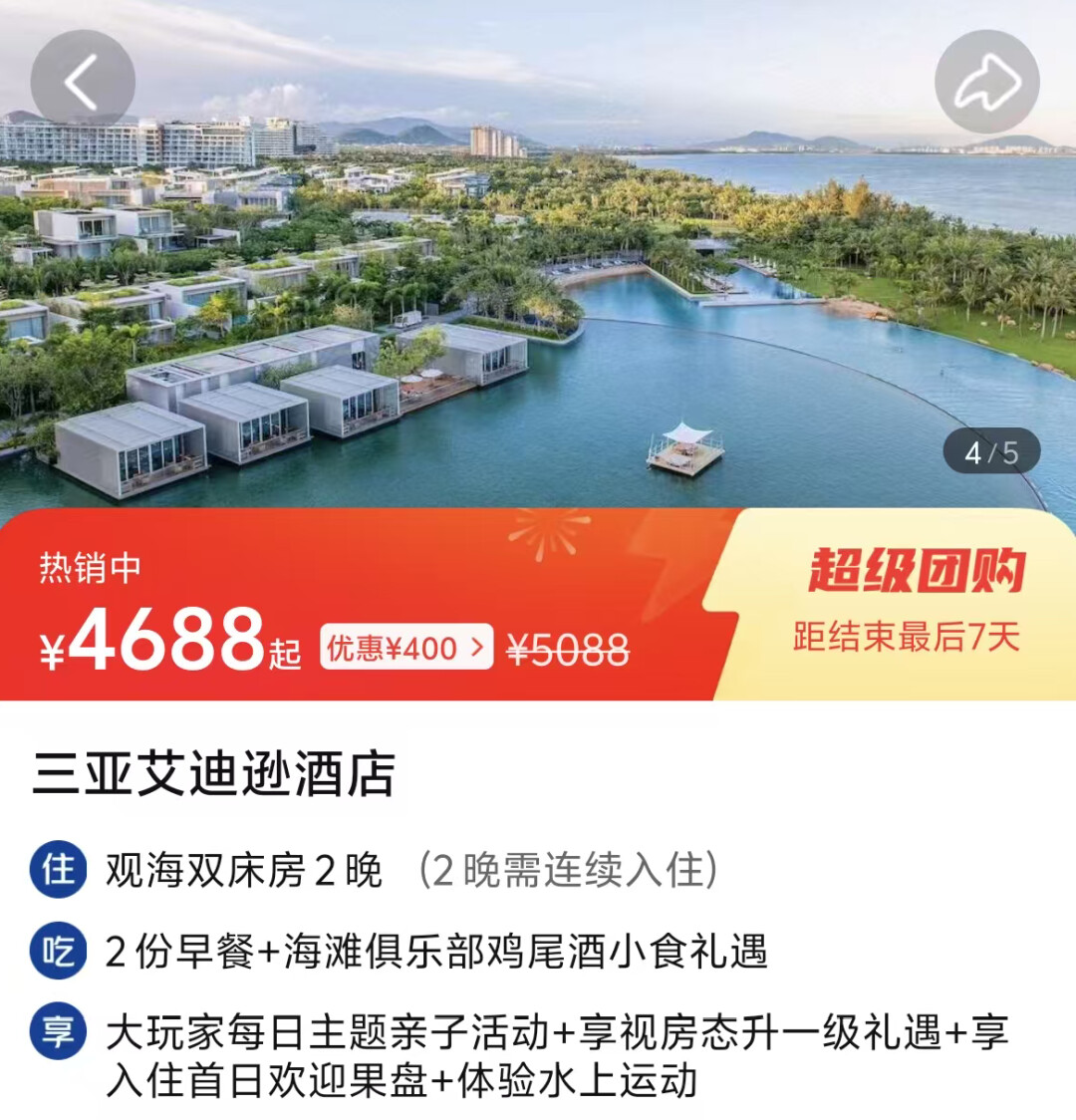 三亚艾迪逊酒店2晚套餐 - 券后4188元(拍1份用-500券)