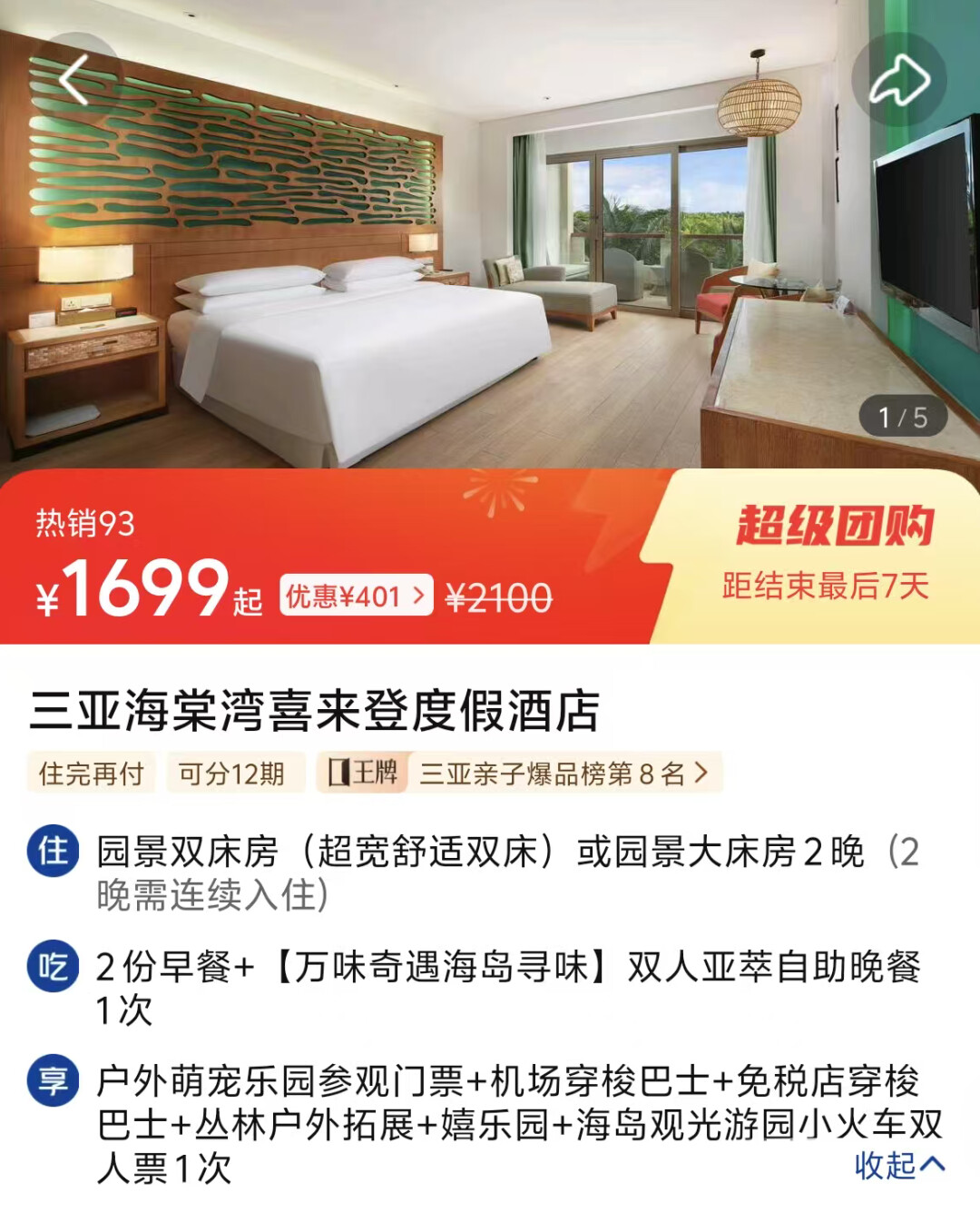三亚海棠湾喜来登度假酒店2晚套餐 - 券后1449元(拍2份用-500券)
