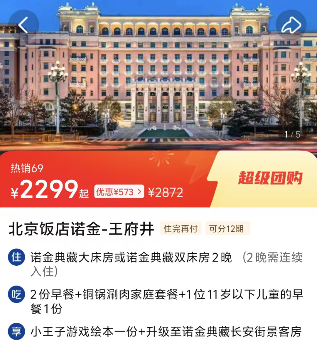 北京饭店诺金-王府井2晚套餐 - 券后1788元(拍1份用-500券)