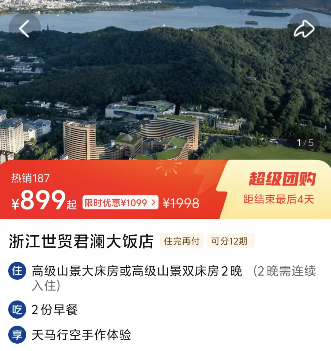 浙江世贸君澜大饭店2晚899元