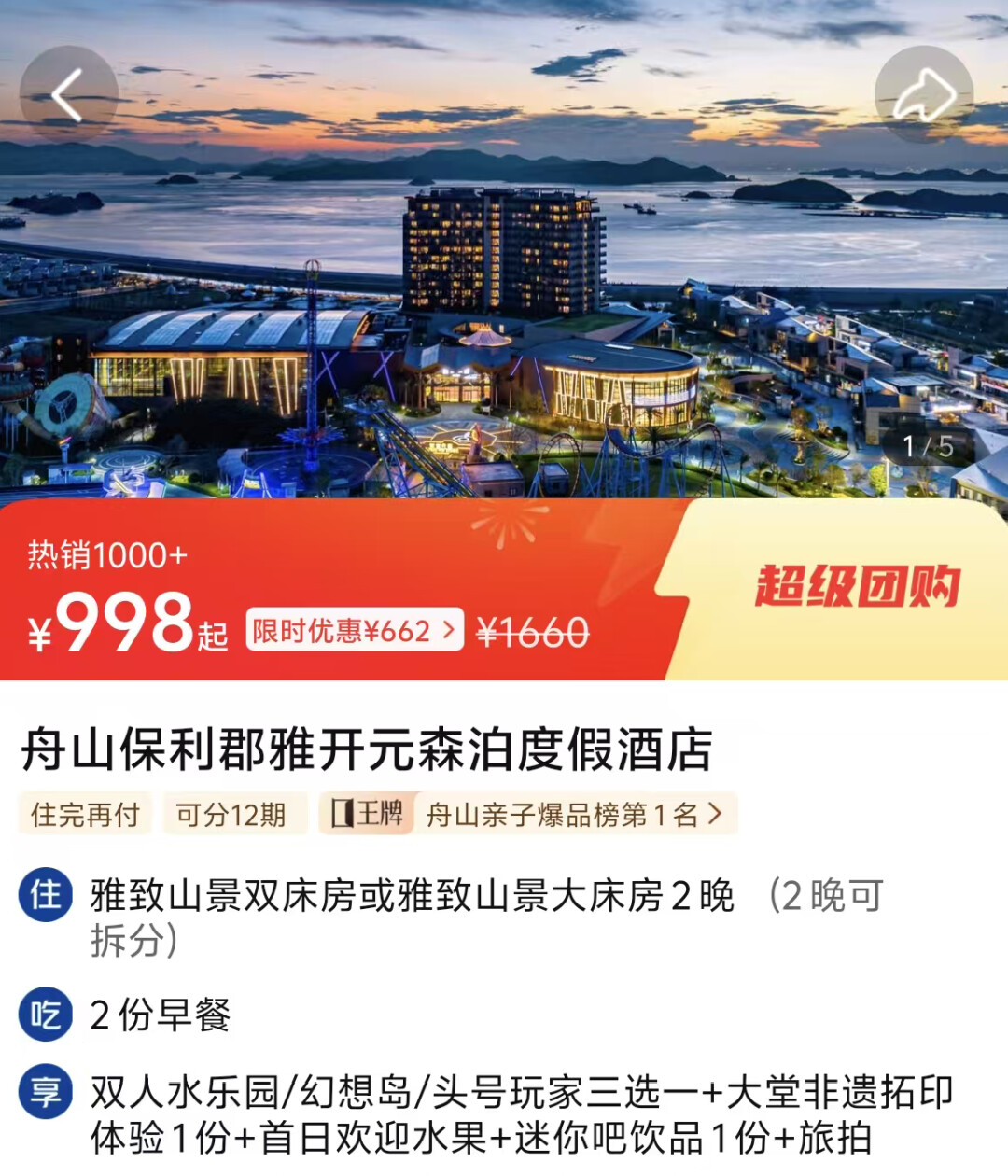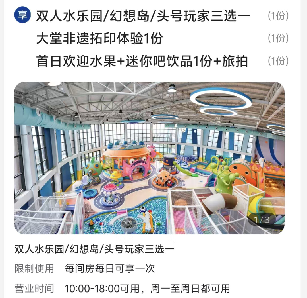 而且还赠送非遗拓印体验、欢迎水果、迷你吧饮品和旅拍服务,2晚可拆分使用,灵活度很高。套餐券后仅需998元,比单独订房+买乐园门票划算太多。