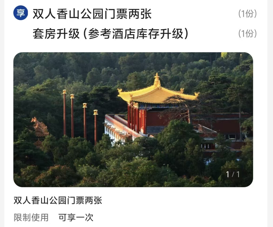 北京香山饭店2晚 - 券后998元(拍1份用-100券)
