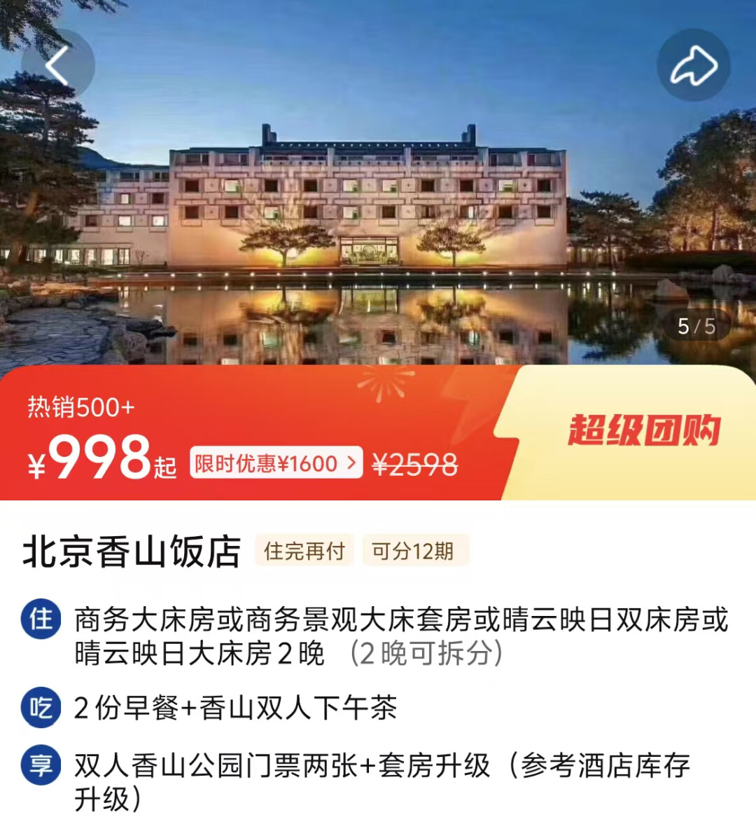 北京香山饭店2晚998元