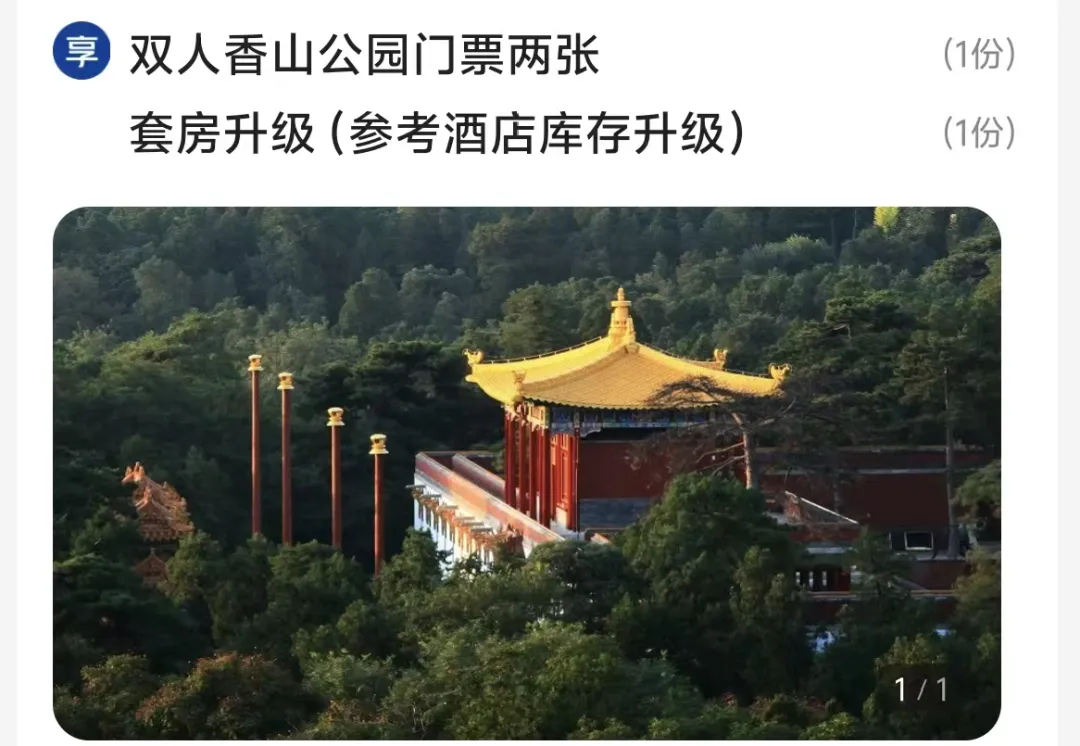 酒店设计融合中式韵味与现代舒适,房间宽敞通透,部分房型自带景观阳台,推窗就能望见山林盛景。套餐包含2晚可拆分住宿,还送双人香山公园门票和特色下午茶。