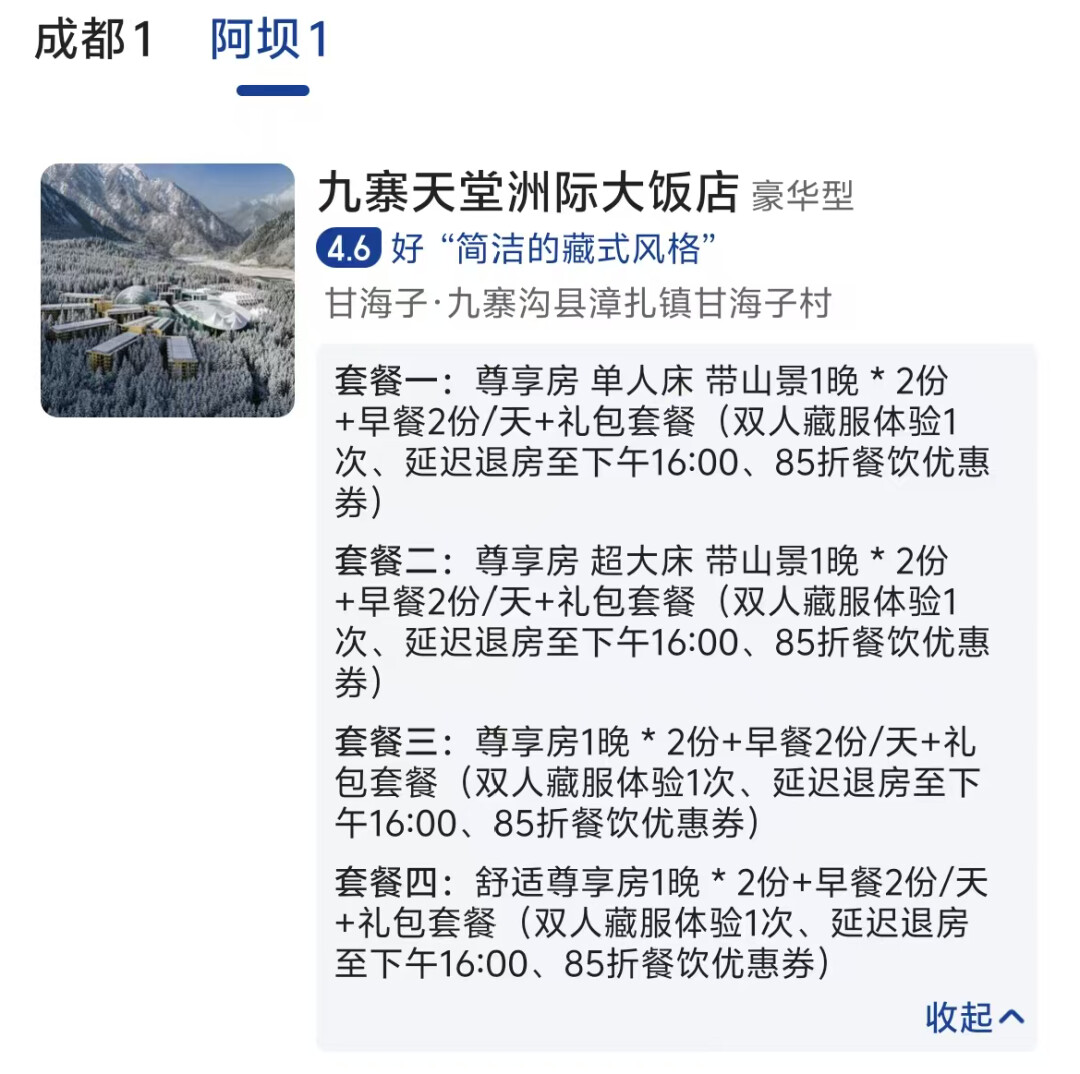 成都天堂洲际+九寨天堂洲际2晚通兑1549元