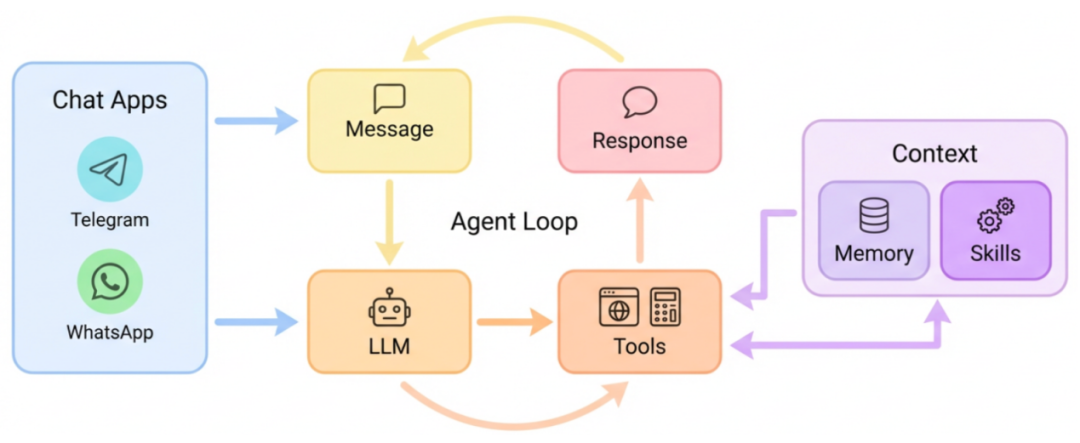 nanobot 的设计哲学很朴素:一个 Python 文件搞定主循环,几个模块处理工具调用,清晰的函数调用关系。你不需要在复杂的类继承和接口抽象中迷失,也不用为了找一个函数在几十个文件间跳转。代码结构就像搭积木一样直观 —— 每个模块职责单一,组合起来就是完整功能。