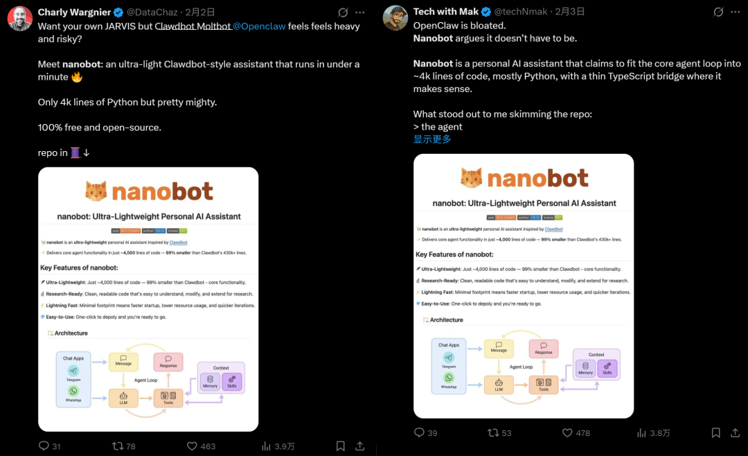 从 40 万行到 4000 行,不只是代码的精简,更是使用体验的提升:2 分钟部署上线、架构清晰易于定制、核心逻辑便于学习。让每个开发者都能轻松搭建自己的贾维斯助手。