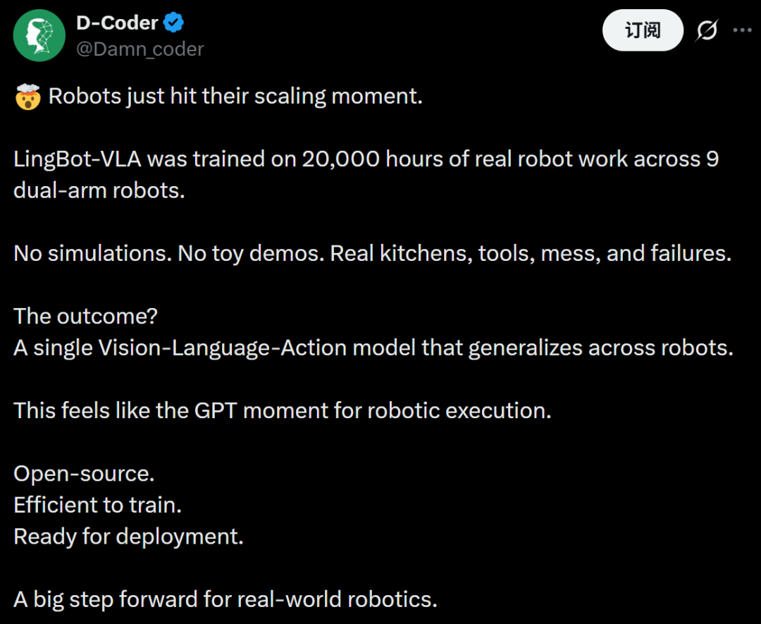 这一思路在 LingBot-VLA 上得到了验证。基于九种主流构型的超两万小时高质量真机数据的预训练,该模型在权威评测中超越了一系列国际顶尖基线。这项技术引发了 AI 社区的关注,人们认为这是现实世界机器人技术的一大进步。