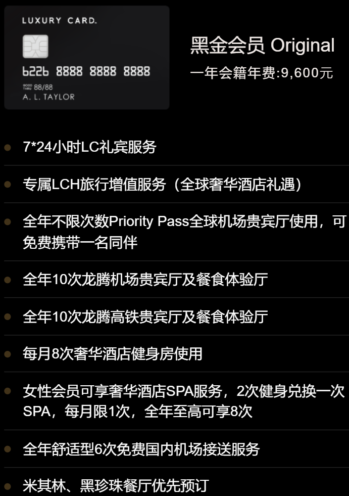 而这,仅仅只是黑金会籍的其中一项权益。另外,无限次PP贵宾厅,10点完整版机场龙腾、10点完整版高铁龙腾,6次接送机,都是妥妥的回血项。