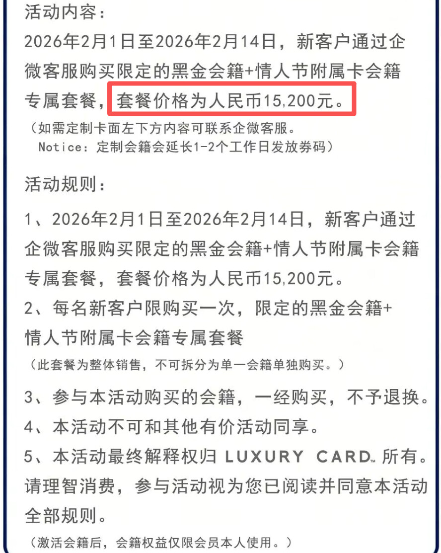 9600元*2,那就是19200元,害,真贵,反正帅帅是舍不得。于是LC精准的刀法来了,情人节附属卡!黑金会籍+情人节附属卡,合计15200元。