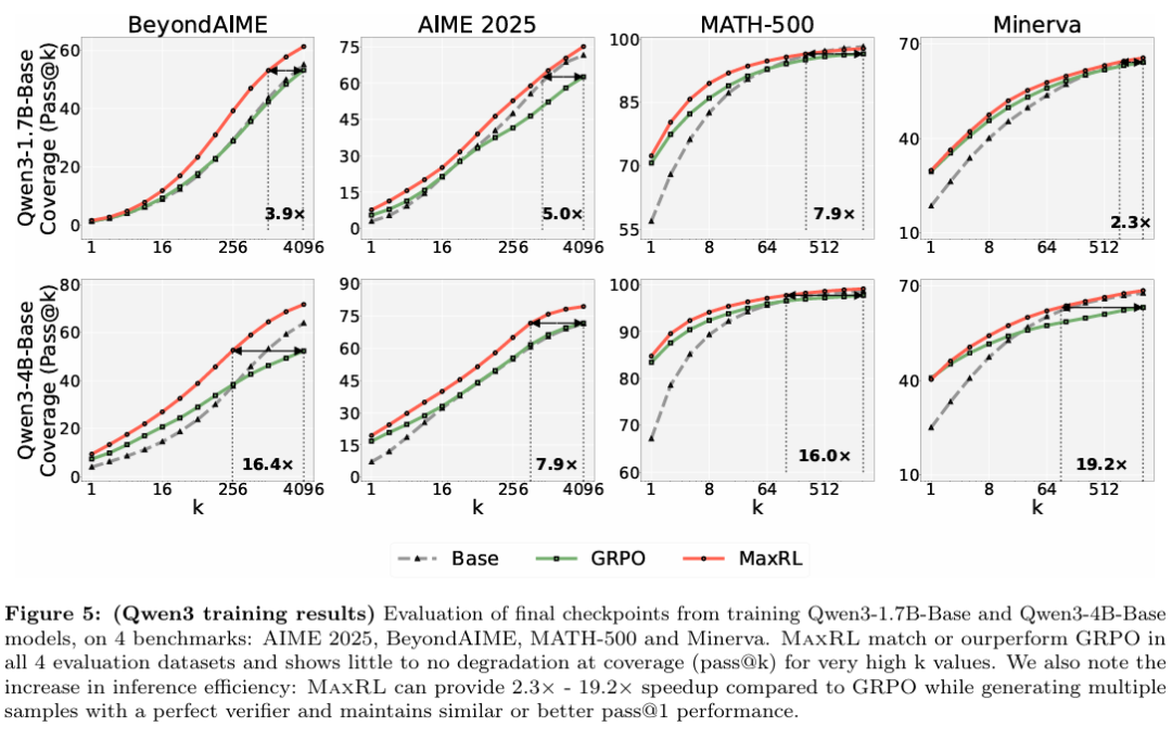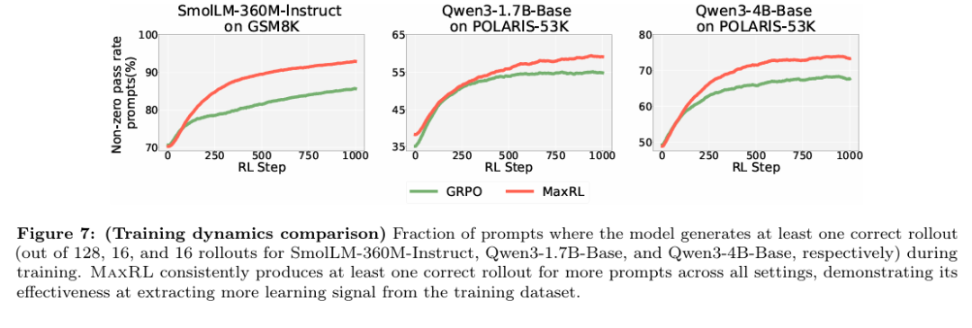 实验结果直观展示了 MaxRL 在训练效率上的优势。在相同训练步数下,MaxRL 性能提升明显更快,并且随着 rollout 数的增加,MaxRL 持续受益。