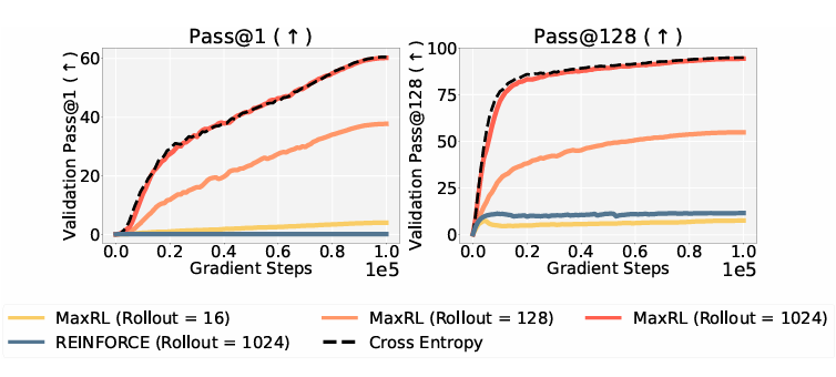 换言之,在 MaxRL 框架下,额外的计算资源不仅改善了估计质量,更直接改进了被优化的目标本身。